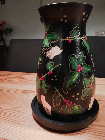 Robuuste zwarte vaas handbeschilderd met hulsttakjes. De rode besjes zitten er nog aan. Deze vaas is 30 cm. hoog en de doorsnede is 19 cm.