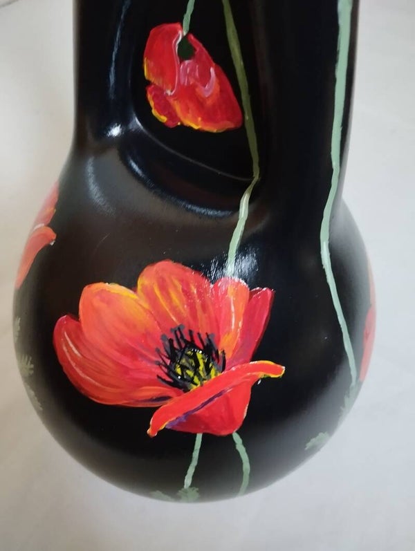 Lange, zwarte vaas bezaaid met felrode klaprozen. Hoogte is 90 cm. en daarmee is deze de langste van een serie van 3.