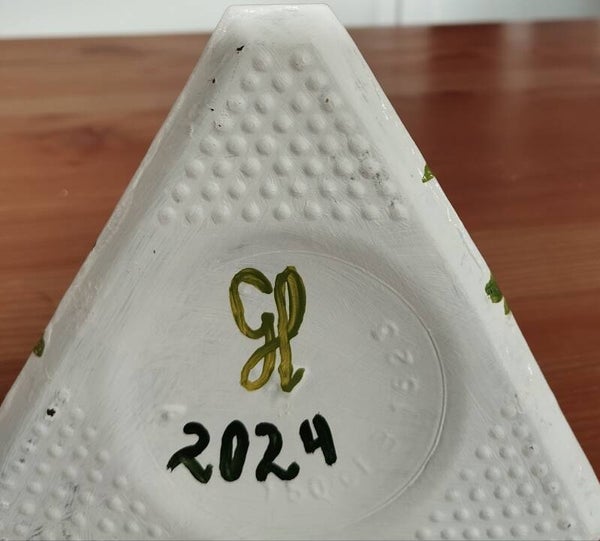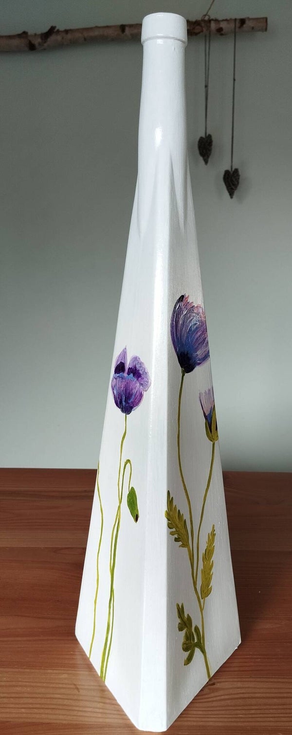 Driehoekige wit geschilderde vaas handbeschilderd met lila klaprozen. Hoogte vaas is 48 cm. en breed 13 cm. per zijde.