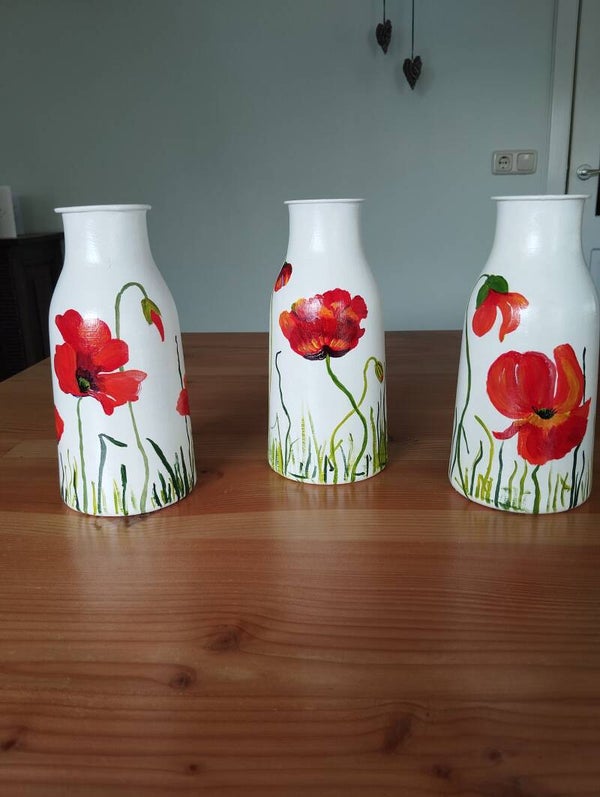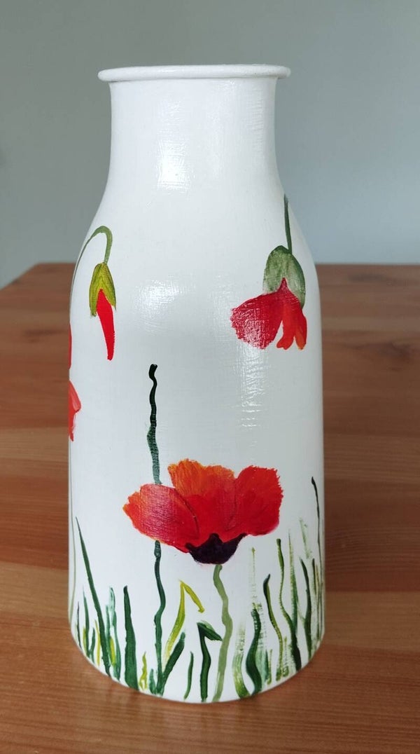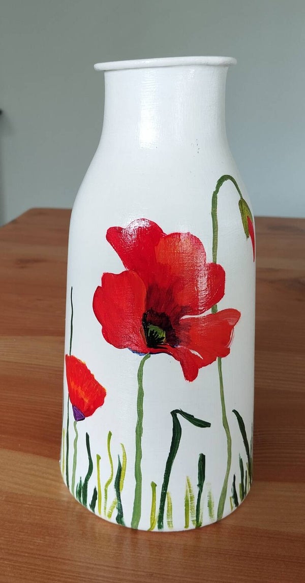 Witte vaas handbeschilderd met rode klaprozen. Hoogte vaas is 21 cm. en doorsnede is 10 cm.