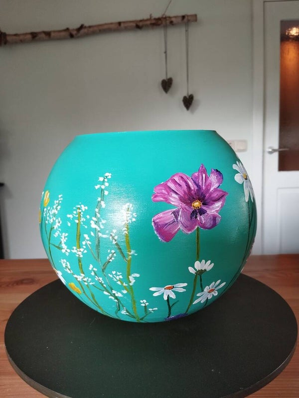 De basiskleur van deze vaas is turquoise met iets van blauw-groen. Handbeschilderd met allerlei voorjaarsbloemen. Met de rondfladderende vlinders erbij ervaar je een lente-achtig gevoel. Kom maar op met dat mooie weer☀️