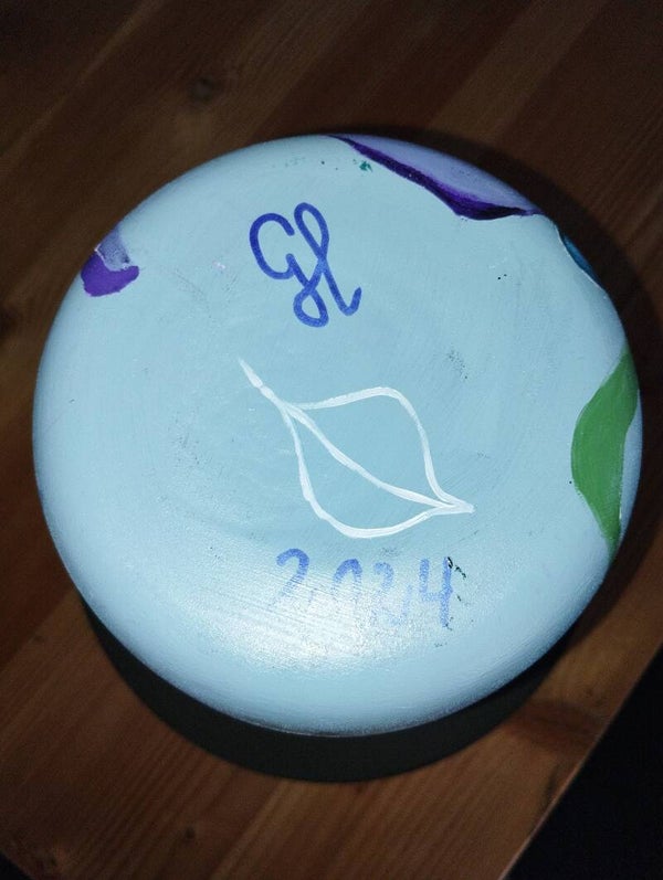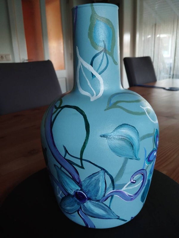 Prachtig coole kleur vaas handbeschilderd met 'agendabloemen', je weet wel, van die gedachtenloze kriebels en krabbels in de schoolagenda van vroeger🙂. Afmetingen: hoog 32, doorsnede 17 cm, hals 6 cm.