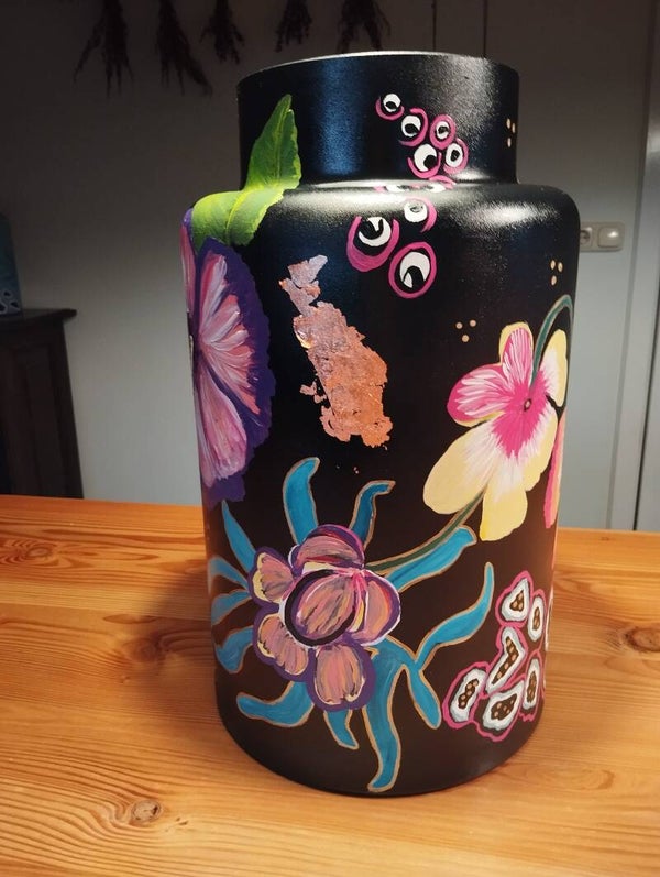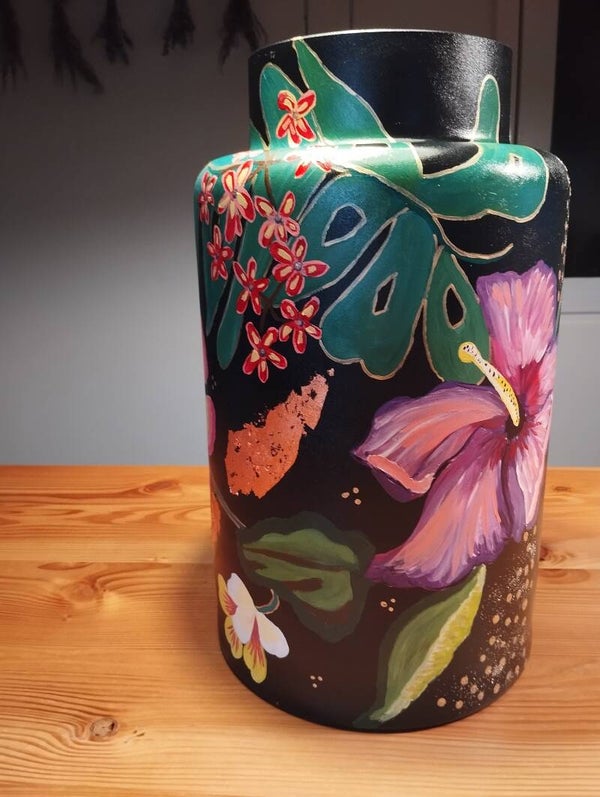 Unieke, diepblauwe melkbusvaas. Eigenlijk lijkt hij zwart qua kleur. Handbeschilderd met o.a. grote hibiscusbloemen. Deze glazen vaas is groot en zwaar. Afmetingen: hoog 43 cm, doorsnede 26 cm., doorsnede hals 18 cm.