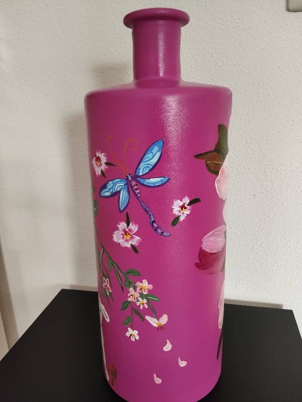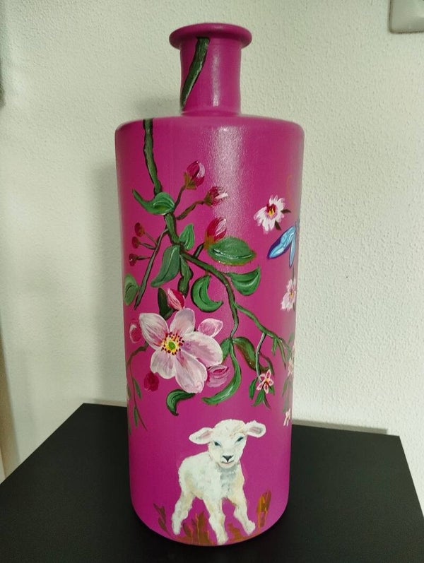 roodviolet/fuchsia kleur vaas handbeschilderd met voorjaarsbloesem en lammetje.
