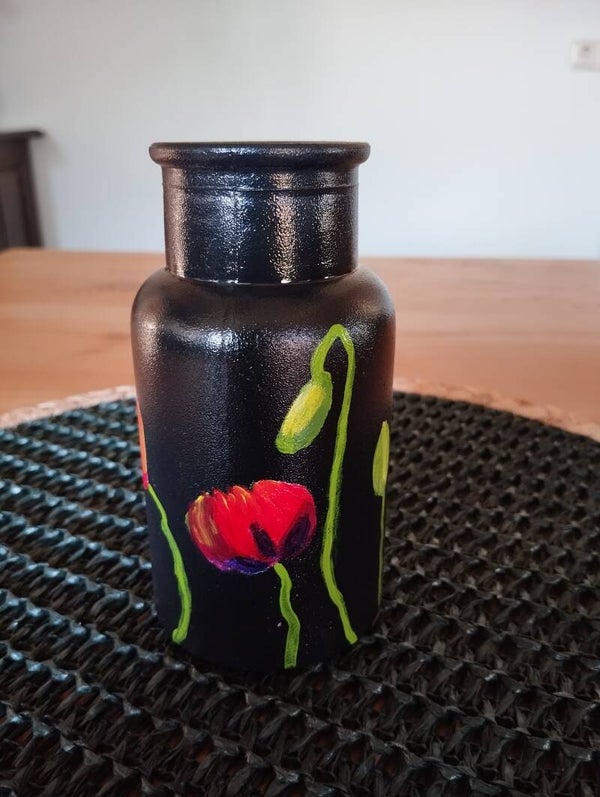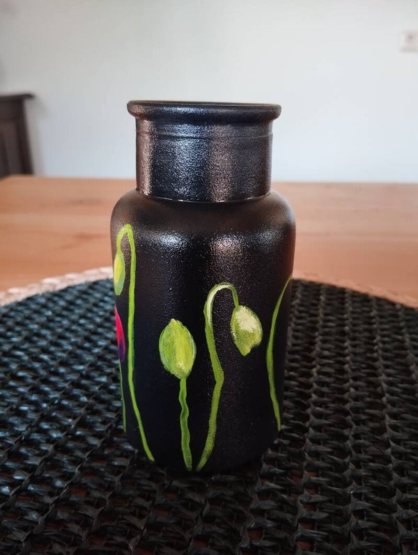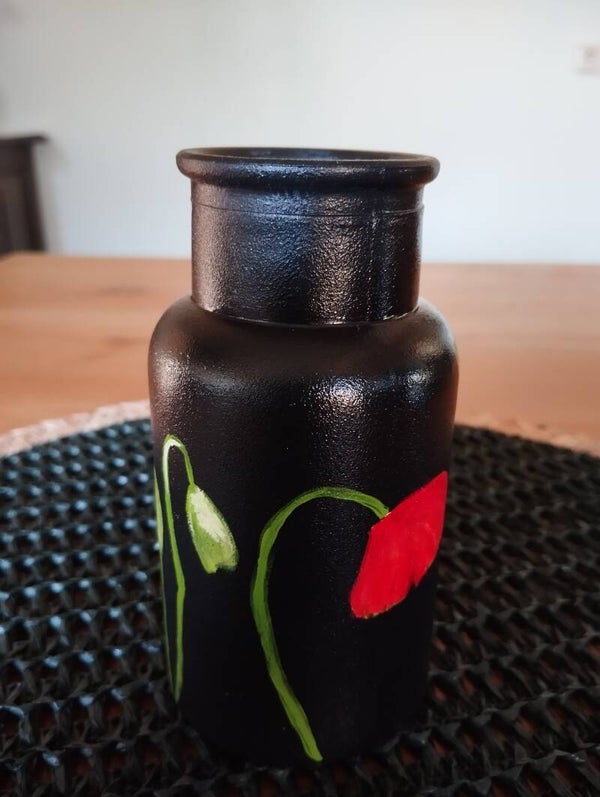 Zwart vaasje handbeschilderd met rode klaprozen. Hoog 13 cm
