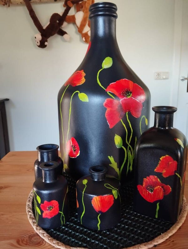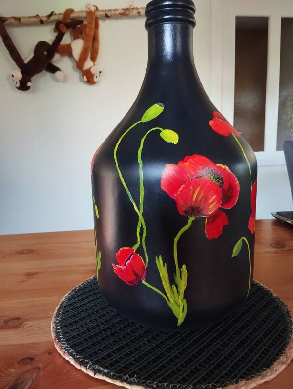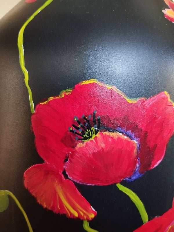 Prachtig glanzende zwarte vaas uitbundig beschilderd met rode klaprozen.