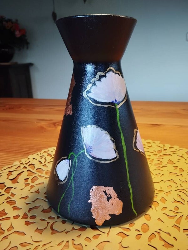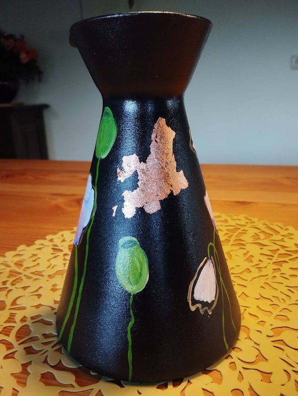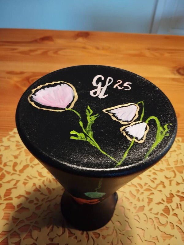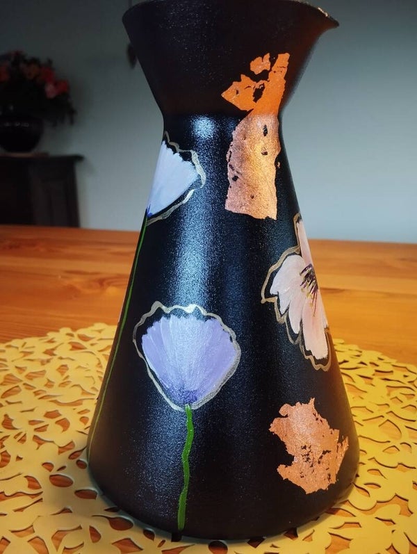 Zwart kanvaasje handbeschilderd met lila bloemen en goudrelief.