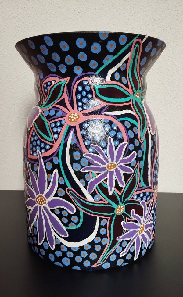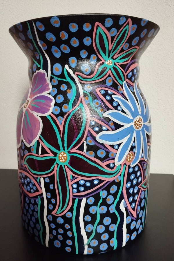 Wie houdt er van bont? Dan kies je deze vaas Ibiza bohemian style. Afmeting: 27 cm. hoog en doorsnee 18 cm. Handbeschilderd en afgewerkt met glansvernis. Op afstand zie ik er iets klassieks in. Of maak ik het nu te bont🤔