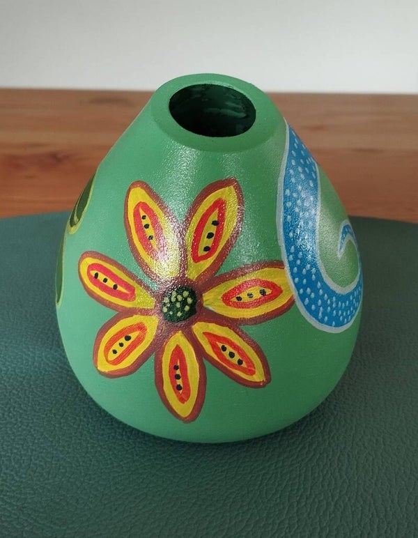 Schattig vaasje in Boho stijl. Onderdeel van de serie groene vazen. Ook leuk samen (zie laatste foto). Vaasje is 12 cm. hoog en afgewerkt met glansvernis