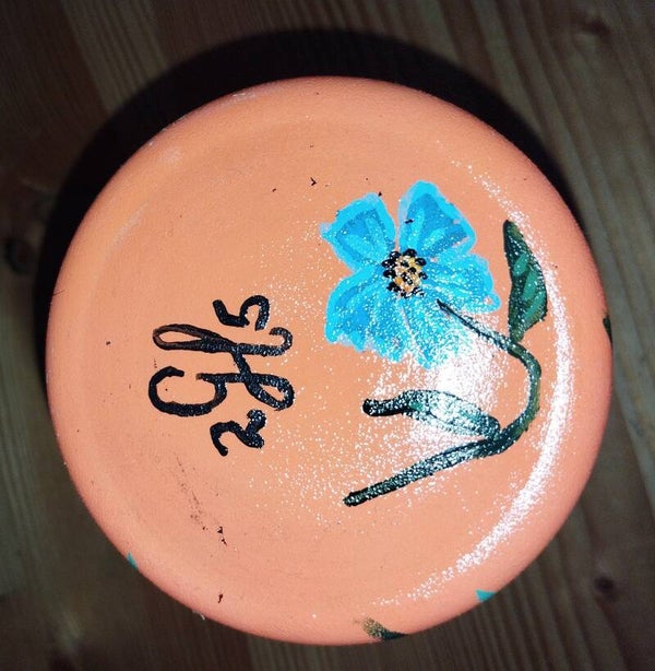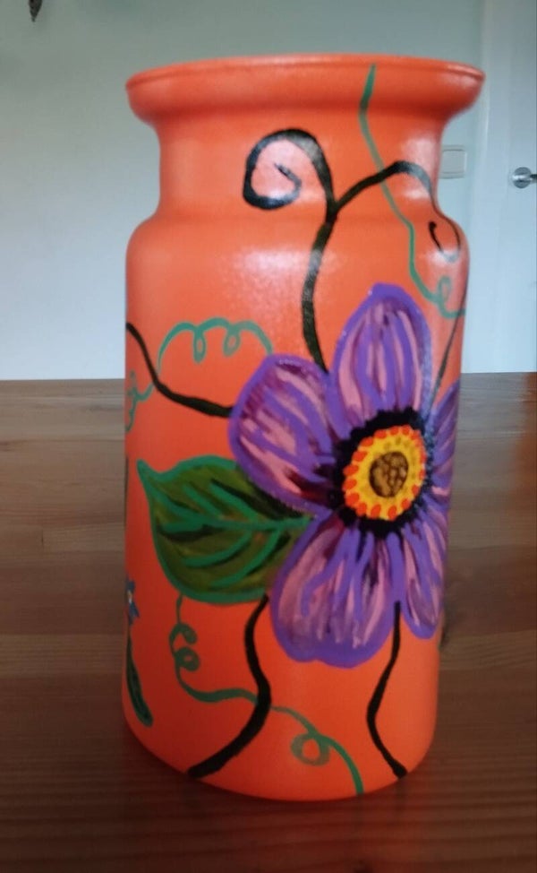 Vrolijke kleur vaas handbeschilderd met zwierige zomerbloeiers.