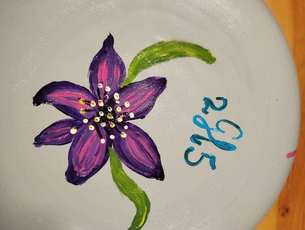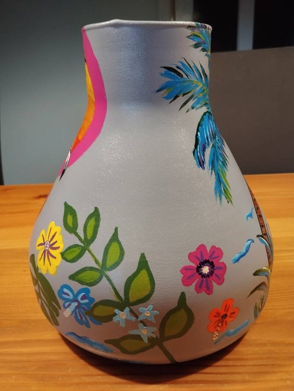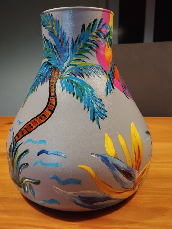 Vrolijke zomerse vaas handbeschilderd met een rose flamingo en palmbomen.