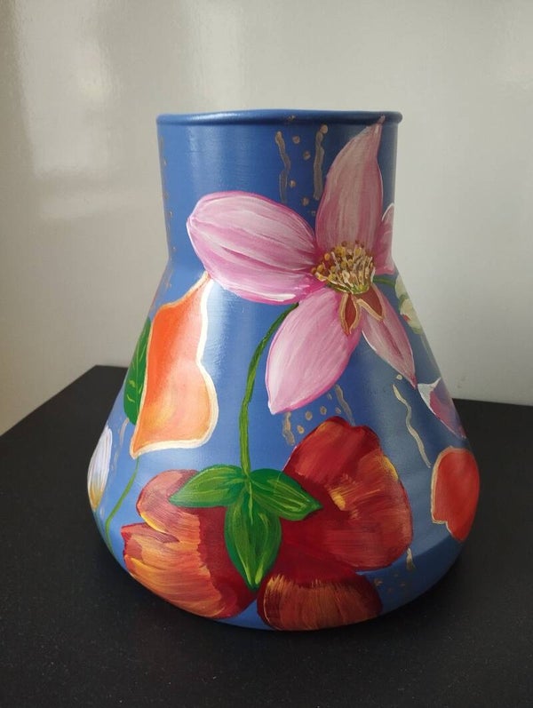 Middernachtblauw heet de kleur van deze glanzende vaas. Handbeschilderd met diverse bloemen. Hoogte 19 cm. Doorsnee hals 10 cm en bodem 18 cm.