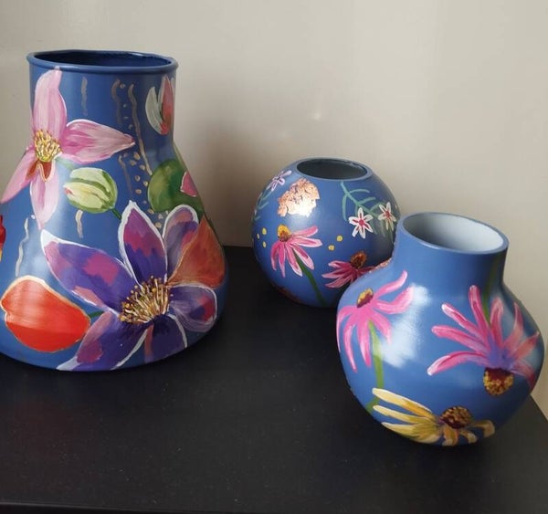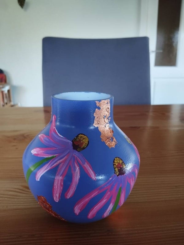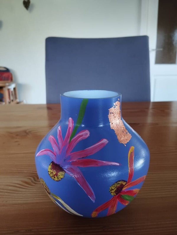 Glanzend blauw vaasje handbeschilderd met zonnehoed. Hoogte vaas is 13 cm.