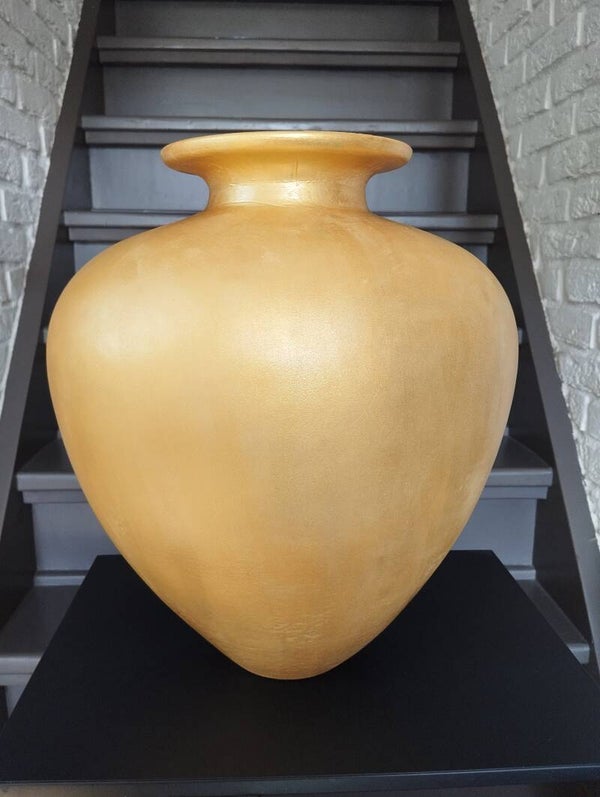 Zware goudkleurige vaas handbeschilderd met citroenen. Afmeting 36x36x10 cm.