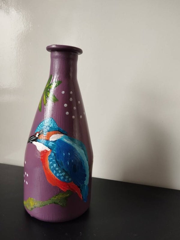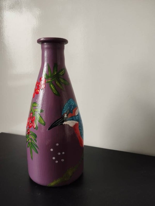 Donker oudroze flesje handbeschilderd met een ijsvogeltje. Hoog 18 cm.