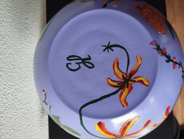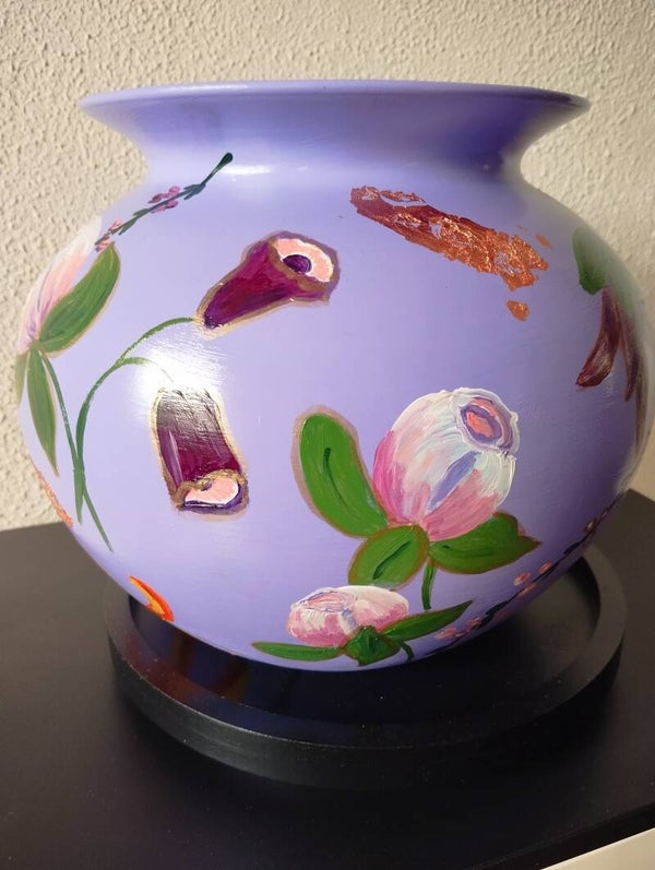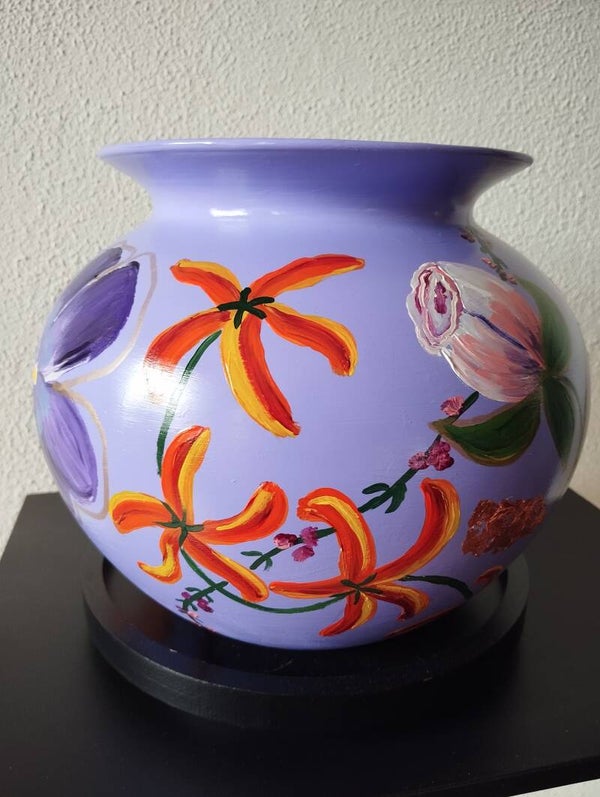 Lila vaas met een vleug kobaltblauw. Handbeschilderd met bloemen en afgewerkt met glansvernis. Hoogte 23 cm en doorsnee 24 cm.