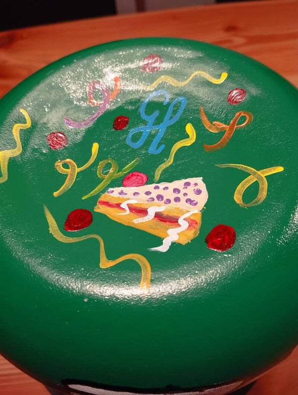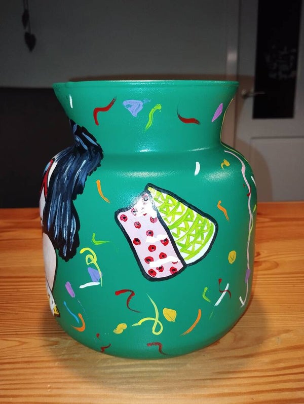 Groene vaas handbeschilderd met dame en taartjes. Vrolijke stijl😋.