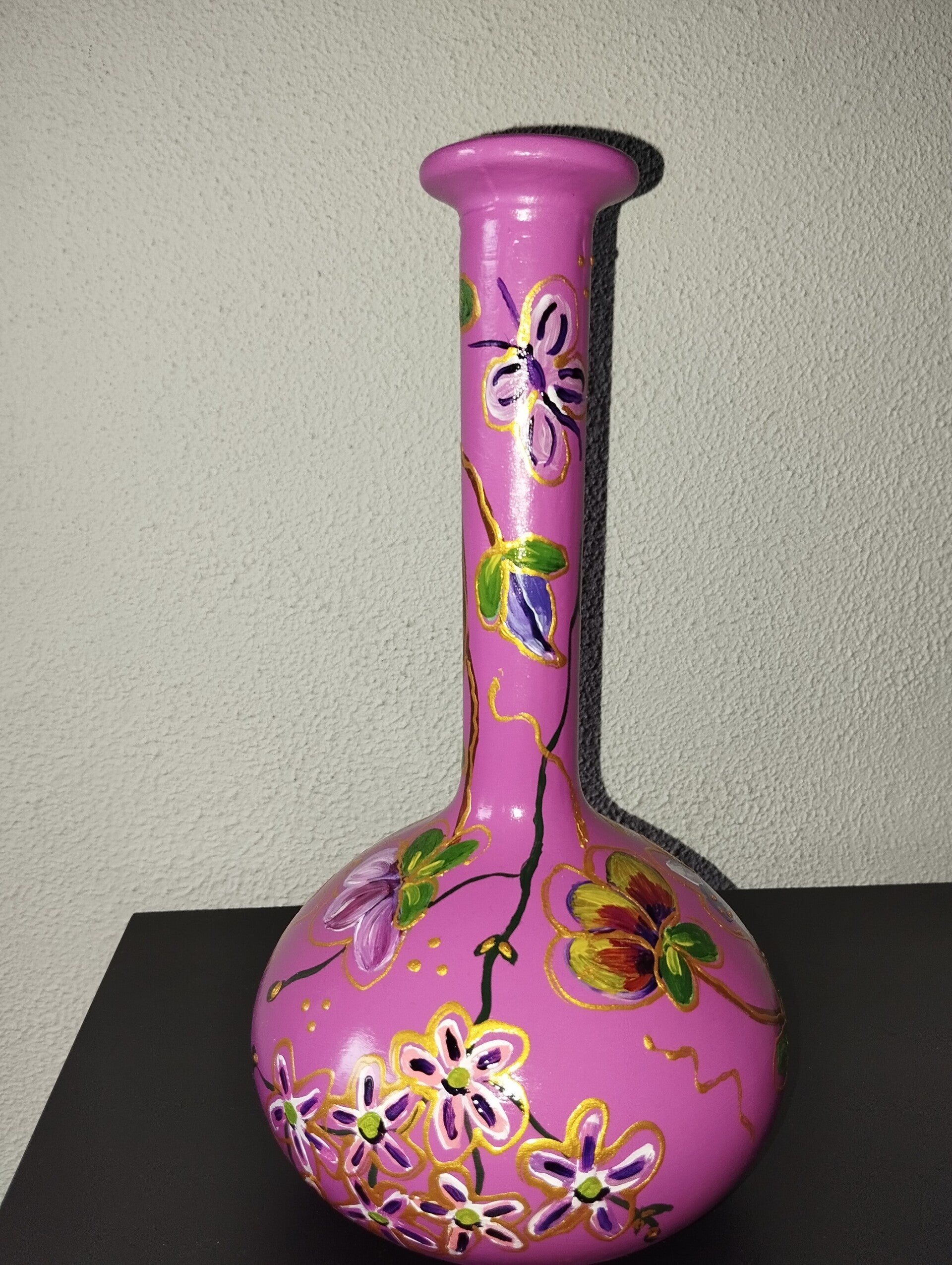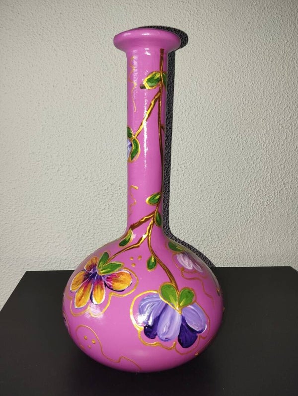 Prachtig glanzend bolvaasje handbeschilderd met vrolijke bloemmotieven en rijkelijk bewerkt met goudrelief'