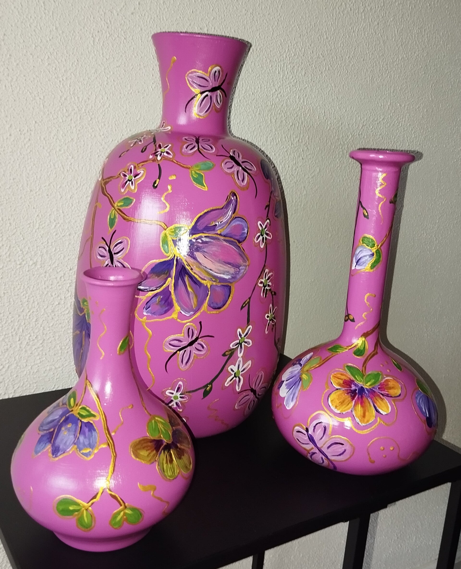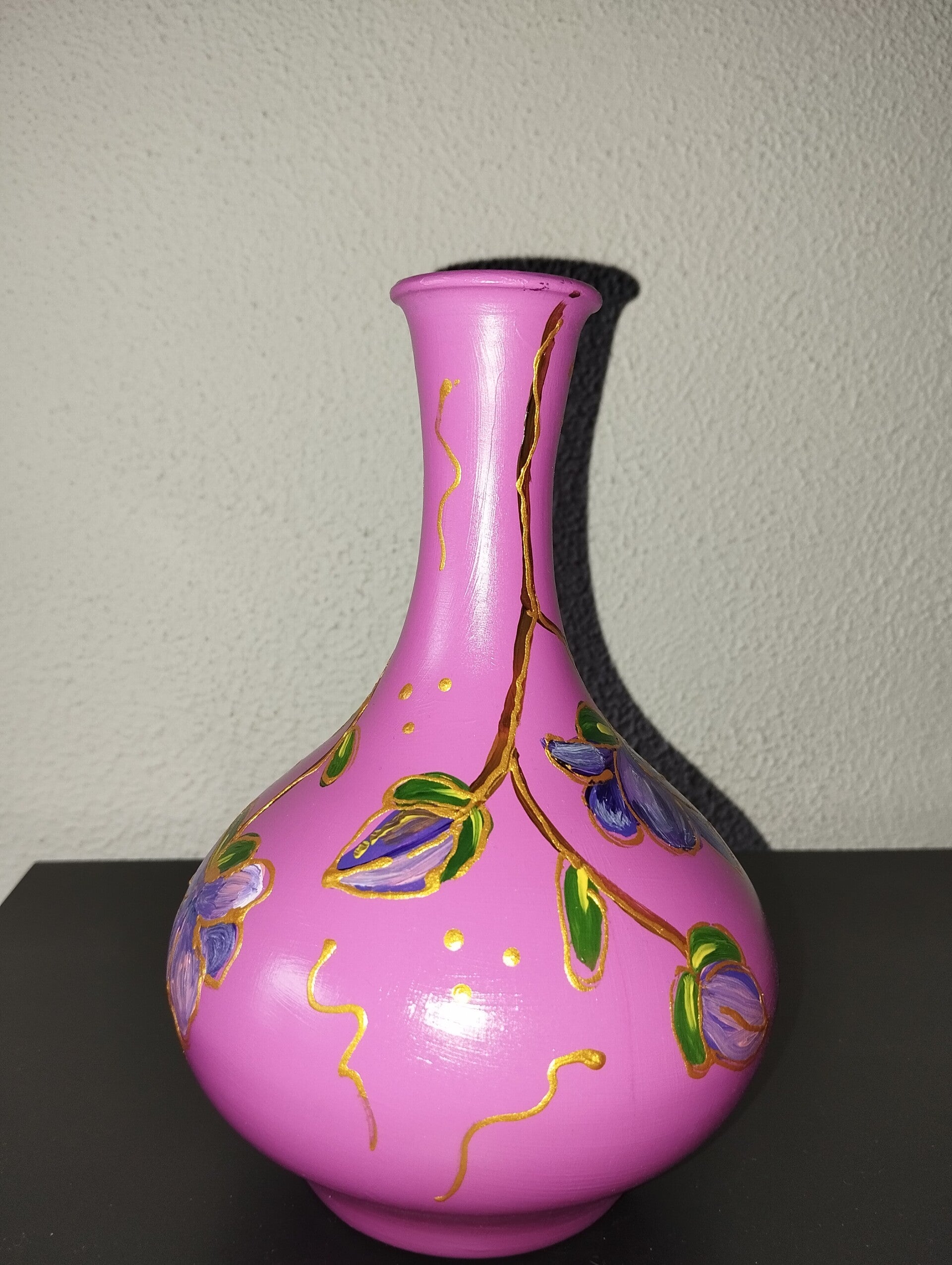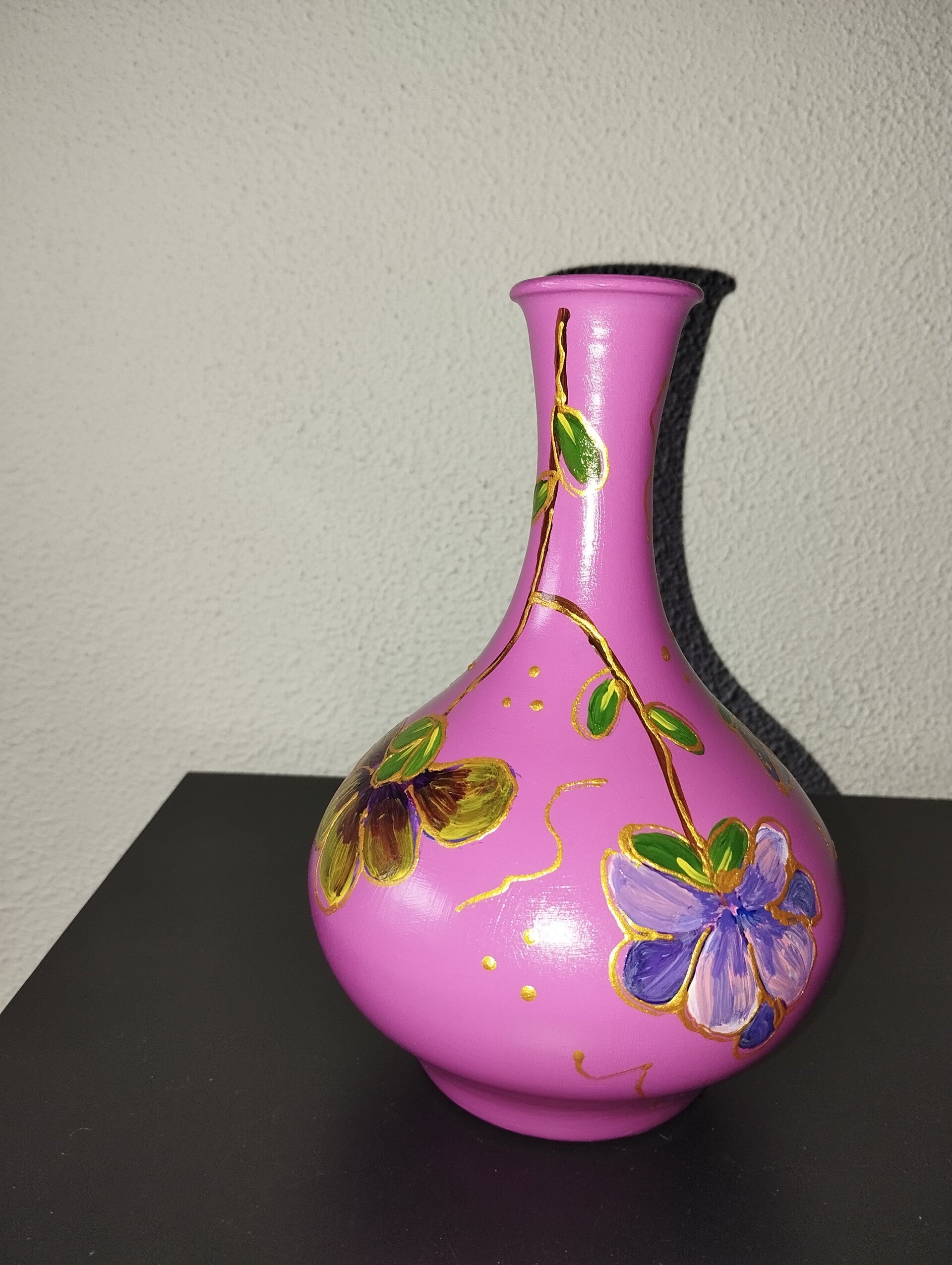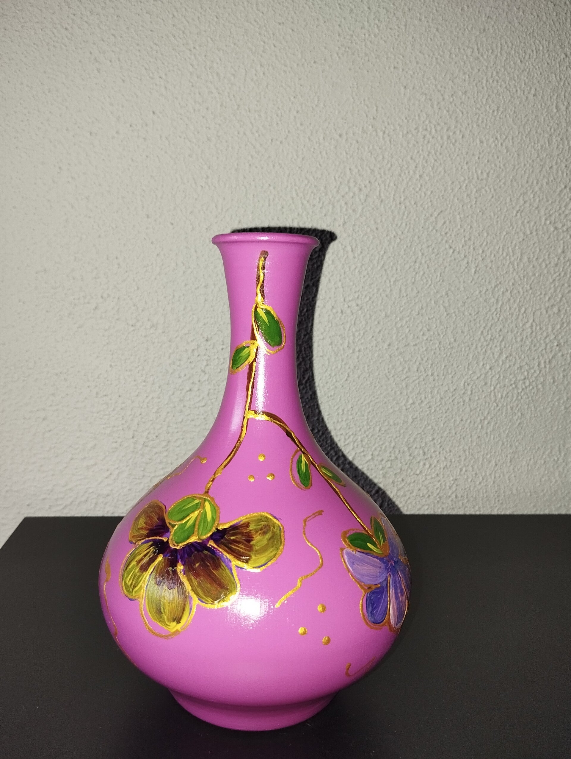Prachtig glanzend vaasje in opvallende kleur. Handbeschilderd met fantasiebloemen en rijkelijk voorzien van goudreliefverf.
