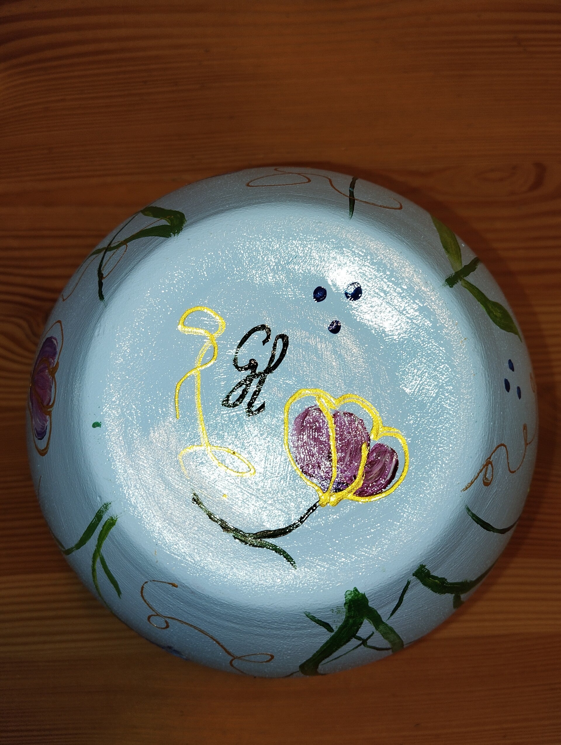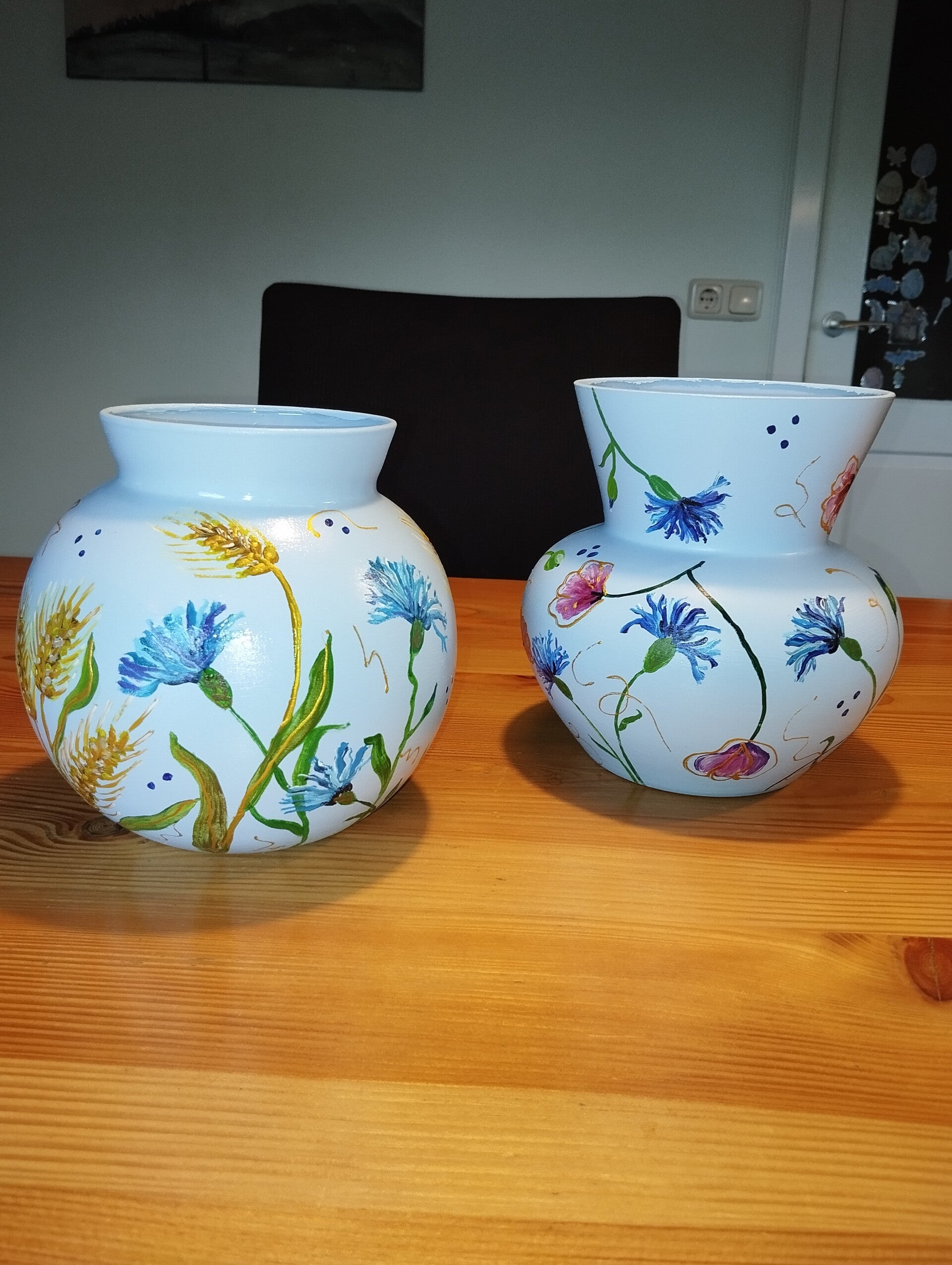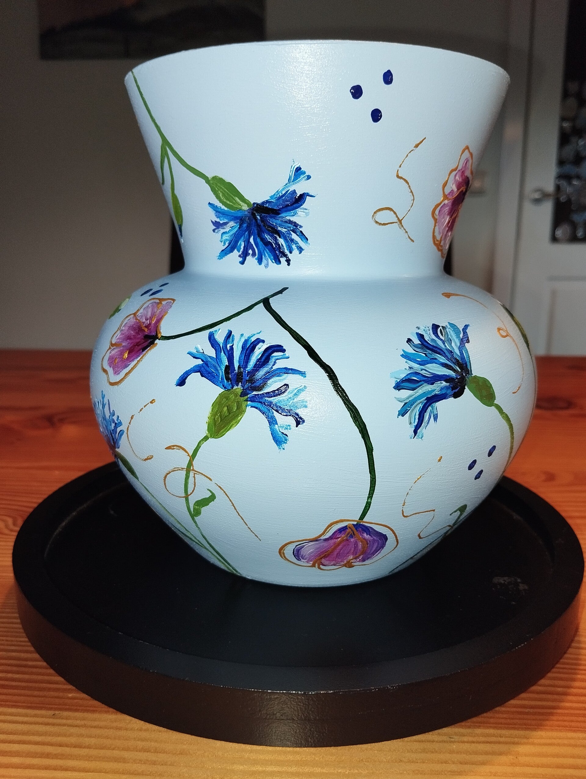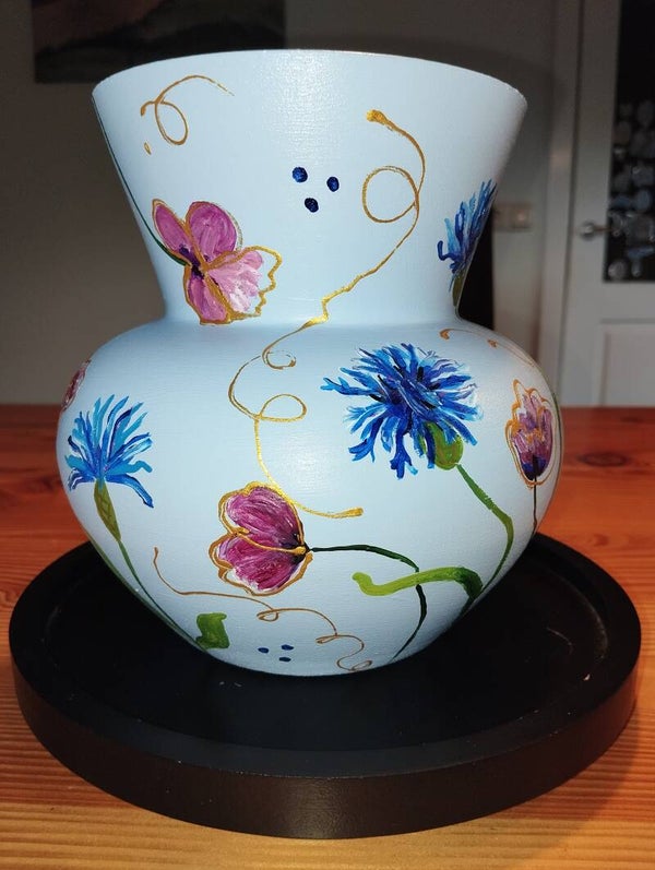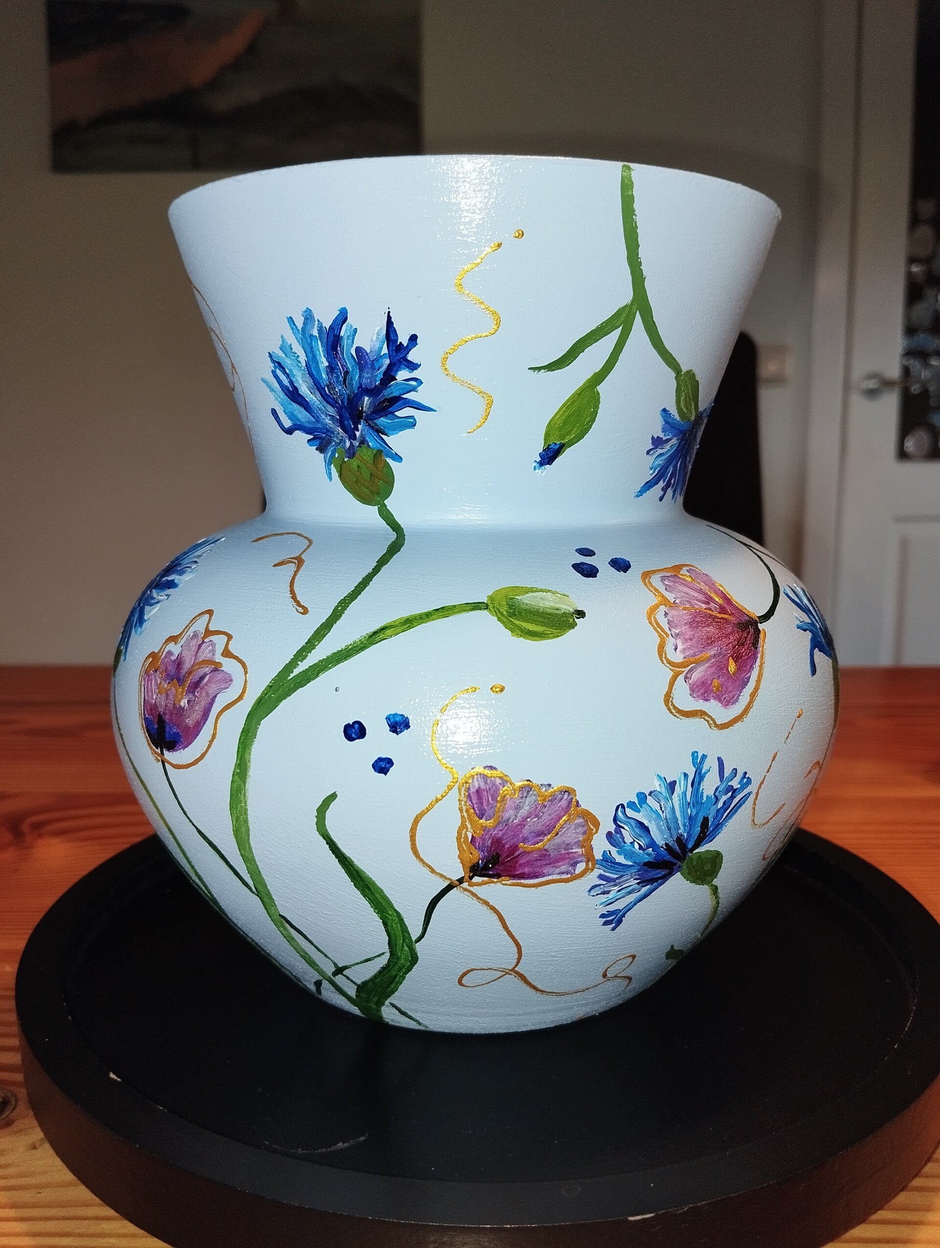 Prachtige kleur lichtblauwe vaas handbeschilderd en afgewerkt met een glansvernis. Hoogte is 19 cm.
