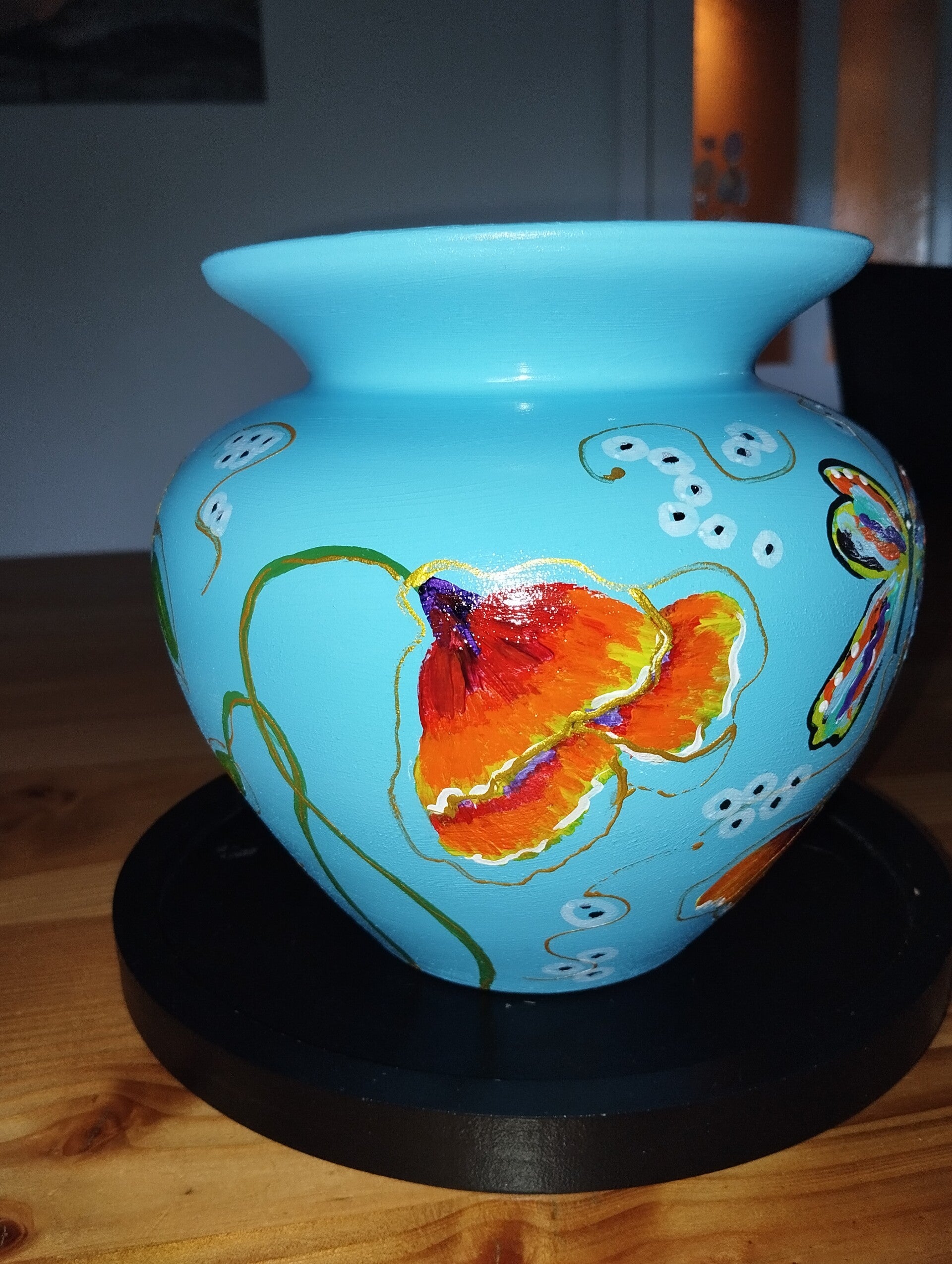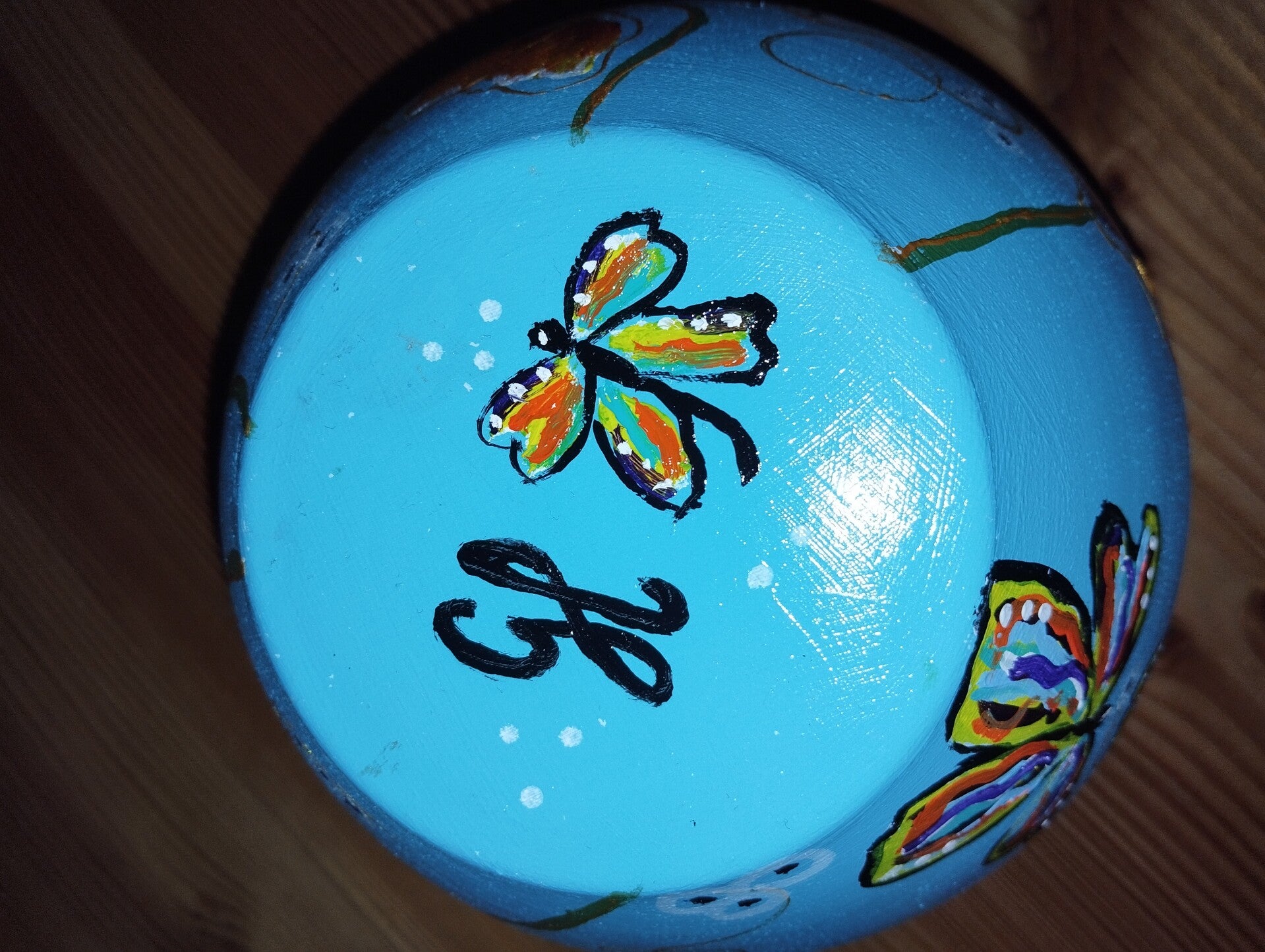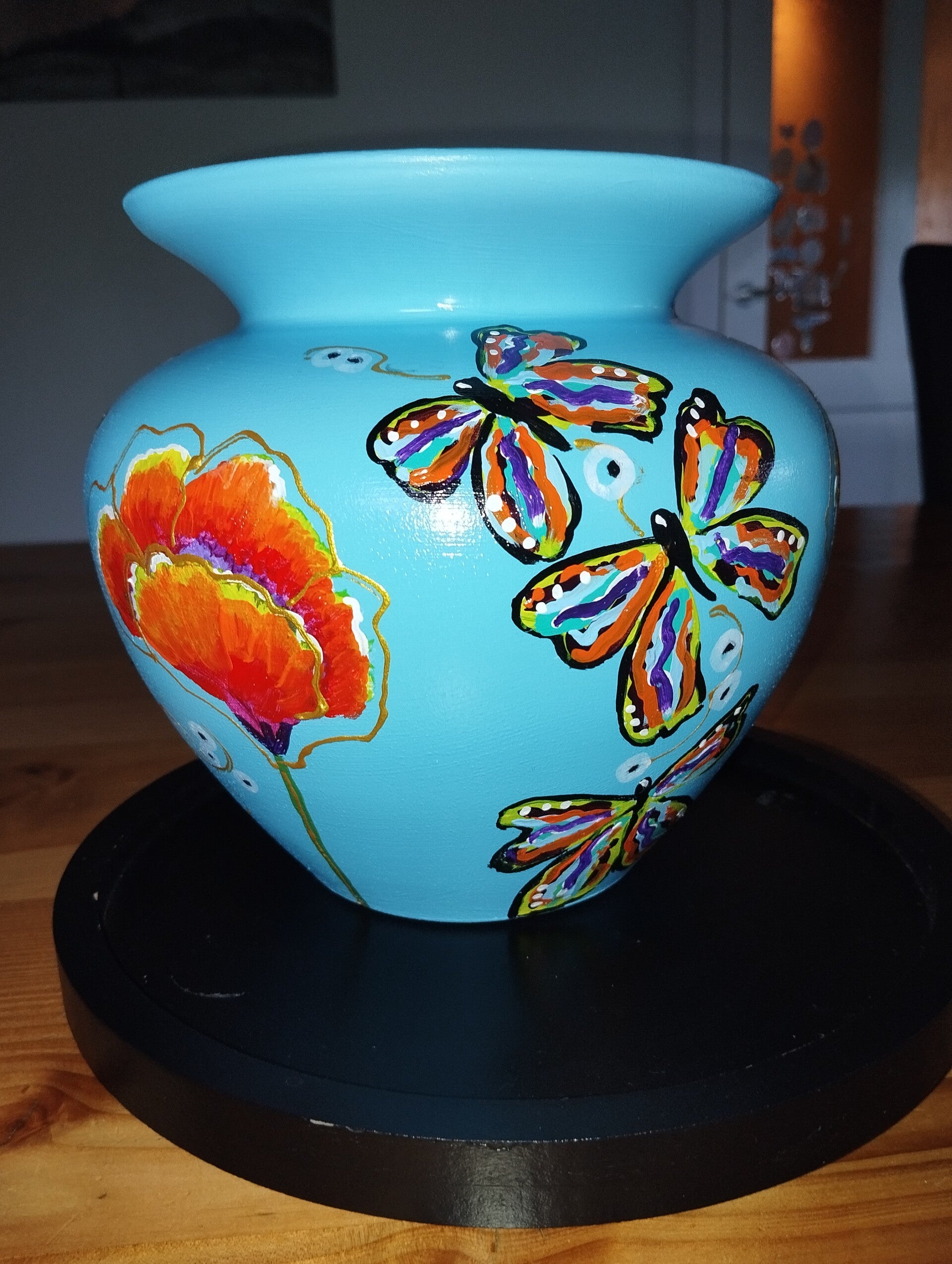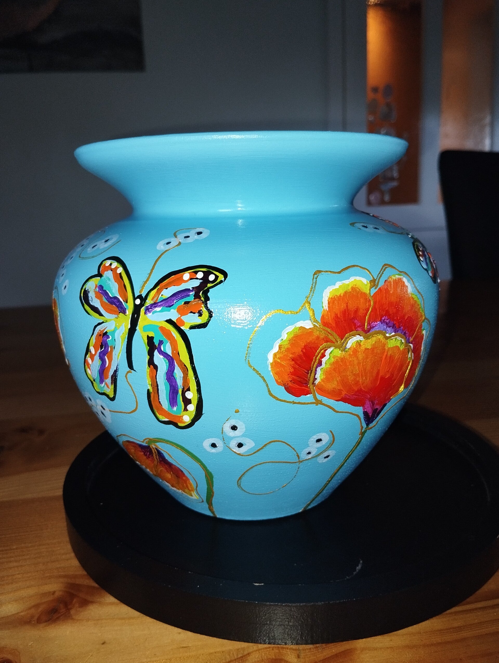 Prachtige kleur turquoise vaas handbeschilderd met bonte vlinders. Hoogte 18 cm.