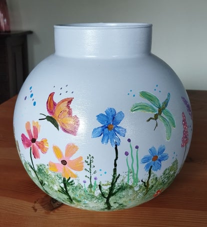 Grijsblauwige bolvaas handbeschilderd met veldbloemen en vlinders.