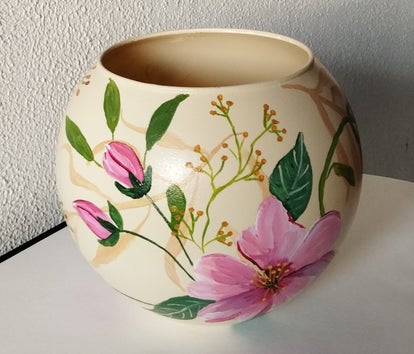 Lichtgeel bolvaasje handbeschilderd met zachte tinten bloemen. Deze schattige vaas is 17 cm. hoog en 17 cm. in doorsnee.