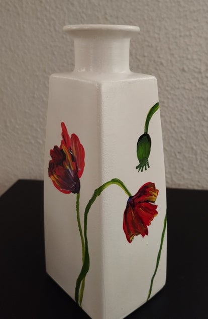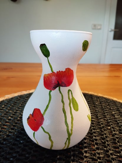 Witte vaas handbeschilderd met rode klaprozen. Hoogte vaas is 21 cm. en doorsnede is 10 cm.