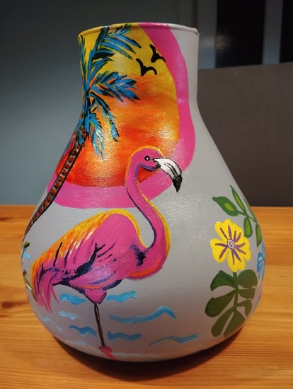 Vrolijke zomerse vaas handbeschilderd met een rose flamingo en palmbomen.